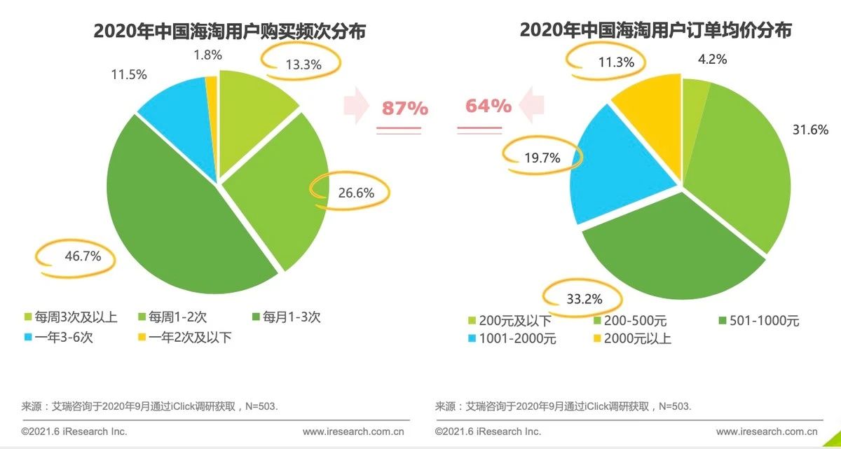 艾瑞咨询相关报告提到,“消费信心在后疫情时代大幅提振,跨境海淘用户的消费频次与消费金额已恢复至较高水平:海淘用户购买频次较高,调研人群中约87%的人每个月至少海淘一次;超过64%的用户在过去一年平均每笔海淘订单金额在500元以上。”(见下图)。