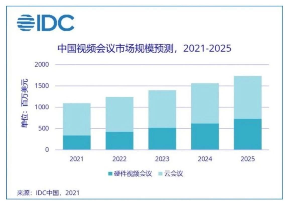 此外,IDC预测,中国视频会议市场规模在2024年将超过100亿元人民币,云会议市场占比将近40%。由于疫情防控的常态化,以及非接触商业的兴起,中国视频会议市场将进入新一轮的增长周期。